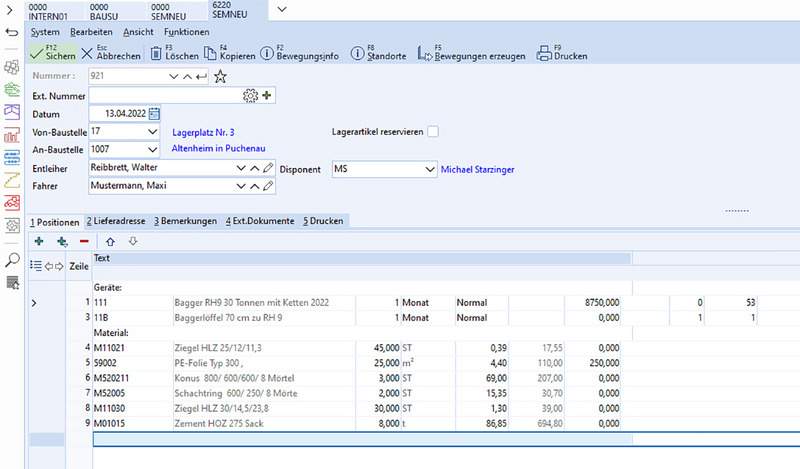 Ist die perfekte Möglichkeit rasch und einfach Geräte und Material vom Bauhof an die Baustelle / den Kunden auszugeben und retour zu erfassen. Die Mehrfachauswahl hilft bei der Erstellung der Zeilen, Sie müssen nur mehr die Mengeneingaben hinzufügen.
