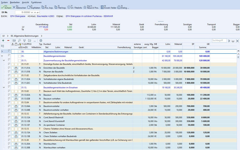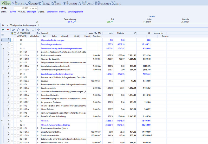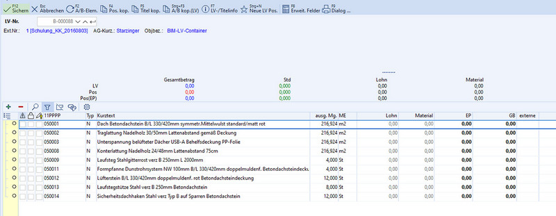Dies steht nach dem „Lehrbuch“ am Beginn einer Kalkulation im LV. Das passende Formblatt – inklusive Musterdaten – können Sie ebenfalls bei uns beziehen und entsprechend Ihren eigenen Anforderungen abändern. Das Programm ist im Standard inkludiert, die Daten kostenpflichtig.